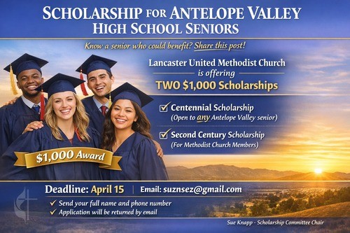 Lancaster United Methodist Church is offering two scholarships for high school seniors transferring to Antelope Valley College, a four-year university, or a trade school. Each award is $1000. The Centennial Scholarship is open to any high school senior in the Antelope Valley. (Maybe you have a young neighbor who would qualify?) Second Century Scholarship is for high school seniors who are currently members of a local Methodist congregation. Please apply soon! The deadline is April 15. If you are interested, send an email request to suznsez@gmail.com. Be sure to include your full name and phone number in your email. I will send a return email with the application attached.